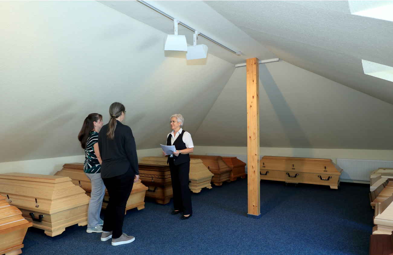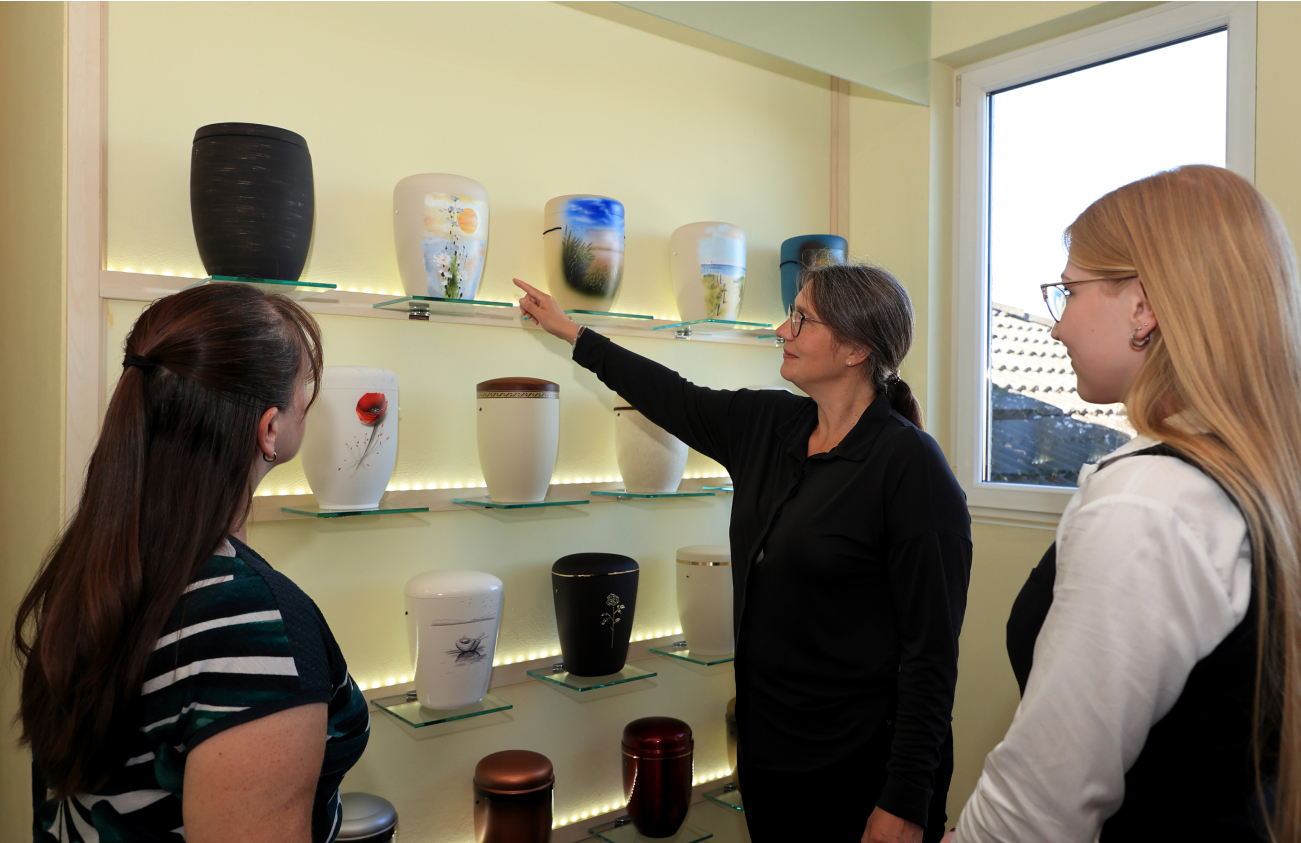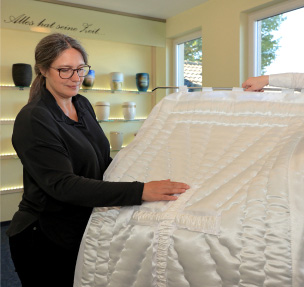 In unserem Ausstellungsraum präsentieren wir Ihnen eine vielfältige Auswahl unterschiedlicher Särge und Urnen – vom einfachen Modell bis hin zum Designerprodukt. Darüber hinaus verfügen wir über Wäschegarnituren und weitere Artikel für die Gestaltung einer persönlichen Abschiednahme. Nehmen Sie sich Zeit, sich hier in Ruhe umzusehen. Wir stehen Ihnen beratend zur Seite.