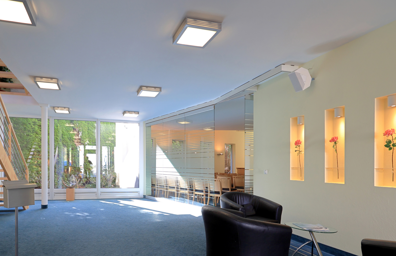 In unserer lichtdurchfluteten Aula können Trauerfeiern mit bis zu 65 Trauergästen stattfinden. Weitere Stehplätze können wir durch das Öffnen einer Glaswand zur Verfügung stellen. Unsere moderne technische Ausstattung bietet eine optimale Akustik für musikalische Einspielungen und Videos. Darüber hinaus ermöglichen wir Ihnen auf Wunsch eine Übertragung der Feierlichkeiten per Livestream für Angehörige, die nicht anreisen können. Abschiednahmen mit kleinen oder großen Trauergesellschaften gestalten wir außerdem in den hiesigen Friedhofskapellen oder an einem anderen Ort Ihrer Wahl. Für den Abschied im kleinen, privaten Kreis haben wir zwei Abschiedsräume geschaffen, in denen der Sarg offen oder geschlossen aufgebahrt wird. Hier verbringen die Hinterbliebenen stille Momente im Gedenken an den Verstorbenen.
