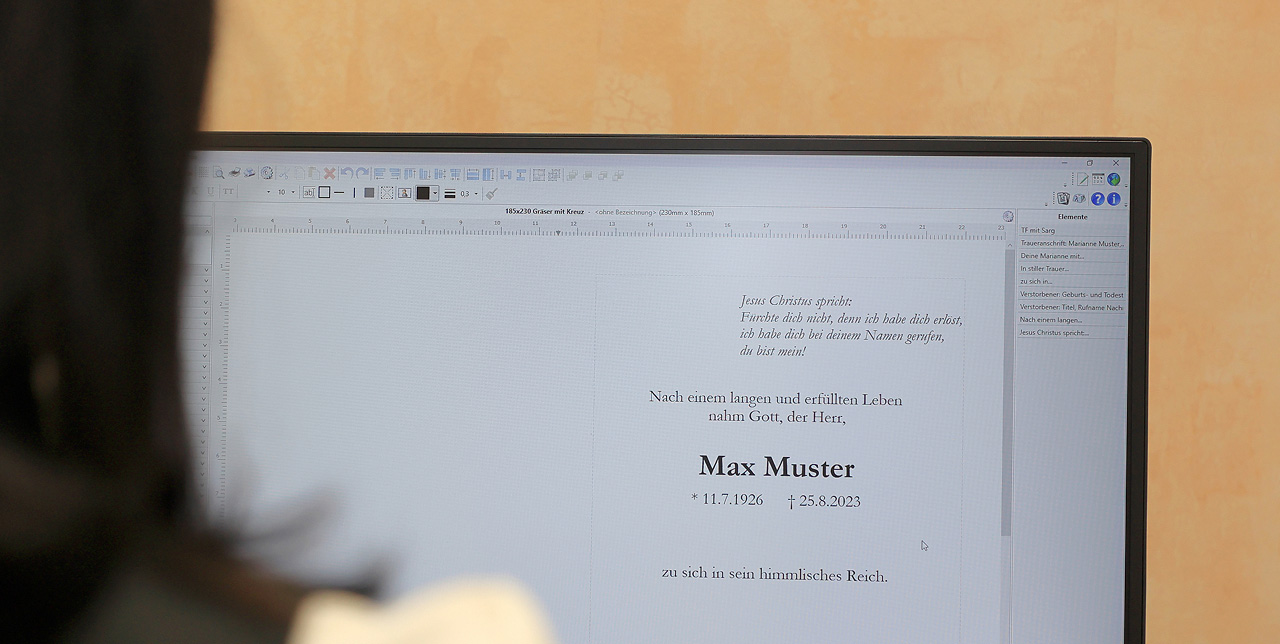 Es gibt verschiedene Wege, die Familie, Verwandte, Freunde, Bekannte und Geschäftspartner über den Eintritt eines Sterbefalls zu informieren. Individuell gestalteter Trauerdruck sind eine Möglichkeit, den Verstorbenen auf eine persönliche Weise zu würdigen und sich an ihn zu erinnern. Gern helfen wir Ihnen bei der Gestaltung und präsentieren Ihnen unterschiedliche Muster für Todesanzeigen, Trauerkarten, Danksagungen und Jahresgedächtnissen.